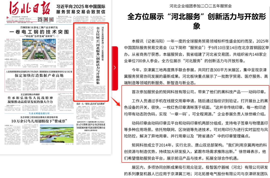 矩网科技携子公司动码印章作为印章管理领域的创新引领者,集中展示在智慧印章领域的前沿技术、最新应用场景和解决方案,获服贸会河北省交易团领导、河北日报媒体记者及众多展会观众的广泛关注,为行业嘉宾带来了一场印章管理数智化的全新体验。