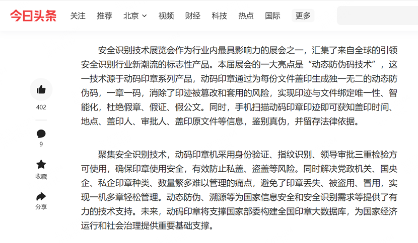 据今日头条、雷科技、搜狐网科技报道,此次安全识别技术展览会作为行业内最具影响力的展会之一,汇集了来自全球的引领安全识别行业新潮流的标志性产品。“动态防伪码技术”是本届展会的一大亮点,这一技术源于动码印章系列产品,动码印章顺利获得为每份文件盖印生成独一无二的动态防伪码,一章一码,消除了印迹被篡改和套用的风险,实现印迹与文件绑定唯一性、智能化,杜绝假章、假证、假公文。同时,手机扫描动码印章印迹即可获知盖印时间、地点、盖印人、审批人、盖印原文件等信息,鉴别真伪,并留存法律依据。 聚集安全识别技术,动码印章机采用身份验证、指纹识别、领导审批三重检验方可使用,确保印章使用安全,有效防止私盖、盗盖等风险。同时解决党政机关、国央企、私企印章种类、数量繁多难以管理的痛点,避免了印章丢失、被盗用、冒用,实现一机多章轻松管理。动态防伪、溯源等为国家信息安全和安全识别需求等给予了有力的技术支持。未来,动码印章将支撑国家部委构建全国印章大数据库,为国家经济运行和社会治理给予重要基础支撑。